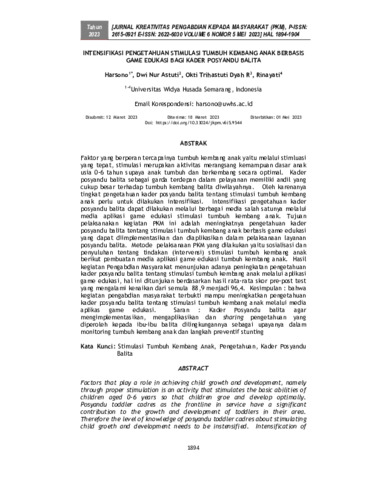 Harsono, Harsono and Astuti, Dwi Nur and Dyah R, Okti Trihastuti and Rinayati, Rinayati (2023) Intensifikasi pengetahuan stimulasi tumbuh kembang anak berbasis game edukasi bagi kader posyandu balita. Jurnal Kreativitas Pengabdian kepada Masyarakat, 6 (5): 21. pp. 1894-1904. ISSN 2615-0921