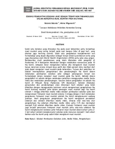 Bahrah, Bahrah and Mirna, Wigunarti (2023) Edukasi pembuatan seduhan jahe sebagai terapi non farmakologis dalam mengatasi mual muntah pada ibu hamil. Jurnal Kreativitas Pengabdian kepada Masyarakat, 6 (5): 26. pp. 1943-1961. ISSN 2615-0921