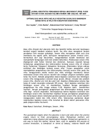 Sopiah, Oon and Resita, Citra and Setiawan, Muhammad Arief and Wariah, Uway (2023) Optimalisasi masa nifas melalui kegiatan sosialisasi bimbingan senam nifas di wilayah Kabupaten Karawang. Jurnal Kreativitas Pengabdian kepada Masyarakat, 6 (5): 30. pp. 1991-2004. ISSN 2615-0921