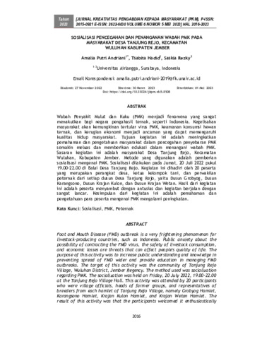 Amalia Putri, Andriani and Tsabita, Hadid and Saskia, Rezky (2023) Sosialisasi pencegahan dan penanganan wabah PMK pada masyarakat Desa Tanjung Rejo, Kecamatan Wuluhan. Jurnal Kreativitas Pengabdian kepada Masyarakat, 6 (5): 32. pp. 2016-2023. ISSN 2615-0921