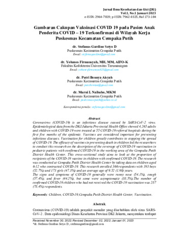 Stefanus Gardino, Setyo D and Yohanes, Firmansyah and Putri Bennya, Aisyah and Murni L, Naibaho (2023) Gambaran cakupan vaksinasi covid 19 pada pasien anak penderita covid–19 terkonfirmasi di wilayah kerja puskesmas Kecamatan Cempaka Putih. Jurnal Ilmu Kesehatan dan Gizi, 1 (1): 16. pp. 173-184. ISSN 2962-0325