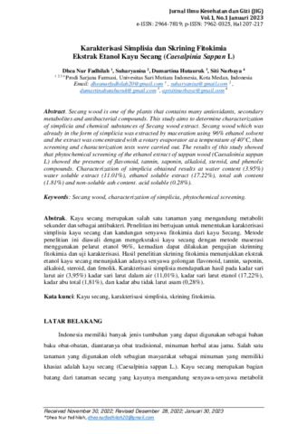 Dhea Nur, Fadhilah and Suharyanisa, Suharyanisa and Dumartina, Hutauruk and Siti, Nurbaya (2023) Karakterisasi simplisia dan skrining fitokimia Ekstrak etanol kayu secang (Caesalpinia sappan l). Jurnal Ilmu Kesehatan dan Gizi, 1 (1): 20. pp. 207-217. ISSN 2962-0325