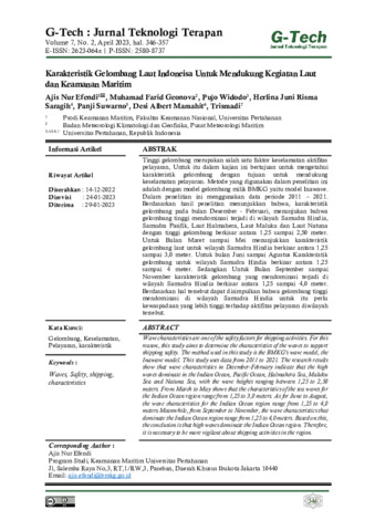 Efendi, Ajis Nur and Geonova, Muhamad Farid and Widodo, Pujo and Saragih, Herlina Juni Risma and Suwarno, Panji and Mamahit, Desi Albert and Trismadi, Trismadi (2023) Karakteristik gelombang laut Indonesia untuk mendukung kegiatan laut dan keamanan maritim. G-TECH: Jurnal Teknologi Terapan, 7 (2): 1. pp. 346-357. ISSN 2580-8737