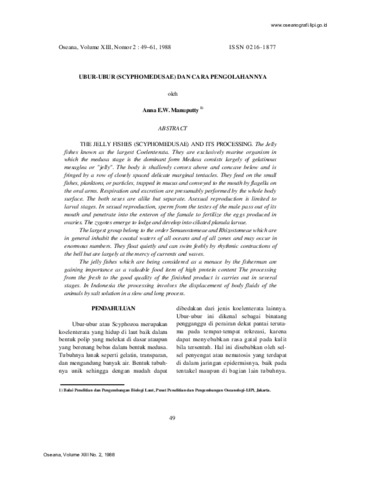 Anna, E.W. Manuputty (1988) Ubur-ubur (scyphomedusae) dan cara pengolahannya. OSEANA, XIII (2): -. pp. 49-61. ISSN 0216-1877
