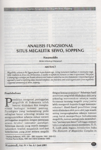 Megalithic culture is the biggest puzzle in pre-historic age. Living monument tradition or continuous megalithic tradition at Sewo site, for instance, is unable to explaint its character or time it represented. This paper is attempting to analyze pre-historic elements and tradition which has no strict limitations. Etnoarchaelogical approach is used to exploring ideas (mental template), site functions and social organization from megalithic supported community of Sewo, Soppeng.