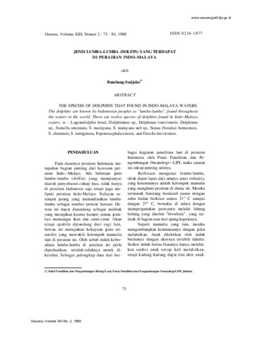 Bambang, Sudjoko (1988) Jenis Lumba-lumba (Dolfin) yang terdapat di perairan Indo-malaya. OSEANA, XIII (2): -. pp. 73-84. ISSN 0216-1877