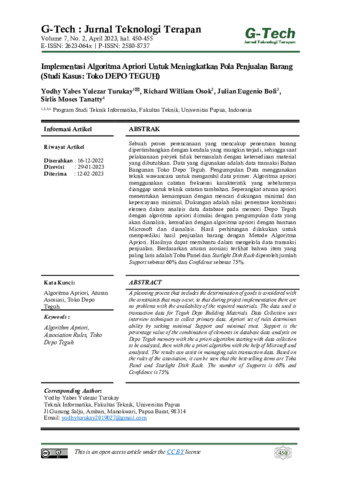 Turukay, Yodhy Yabes Yulezar and Osok, Richard William and Boli, Julian Eugenio and Tanatty, Sirlis Moses (2023) Implementasi algoritma apriori untuk meningkatkan pola penjualan barang (studi kasus: Toko Depo Teguh). G-TECH: Jurnal Teknologi Terapan, 7 (2): 12. pp. 450-455. ISSN 2580-8737