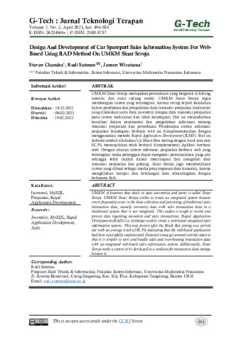 Steven, Chandra and Rudi, Sutomo and Jansen, Wiratama (2023) Design and development of car sparepart sales information system for webbased using RAD method On UMKM Sinar Seroja. G-TECH: Jurnal Teknologi Terapan, 7 (2): 17. pp. 494-503. ISSN 2580-8737