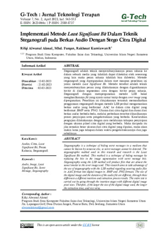 Rifqi Alwanul, Akmal and Mhd., Furqan and Rakhmat, Kurniawan R (2023) Implementasi metode least significant bit dalam teknik steganografi pada berkas audio dengan stego citra digital. G-TECH: Jurnal Teknologi Terapan, 7 (2): 22. pp. 543-553. ISSN 2580-8737