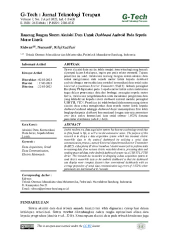 Ridwan, Ridwan and Nuryanti, Nuryanti and Radifan, Rifqi (2023) Rancang bangun sistem akuisisi data untuk dashboard android pada sepeda motor listrik. G-TECH: Jurnal Teknologi Terapan, 7 (2): 30. pp. 618-626. ISSN 2580-8737