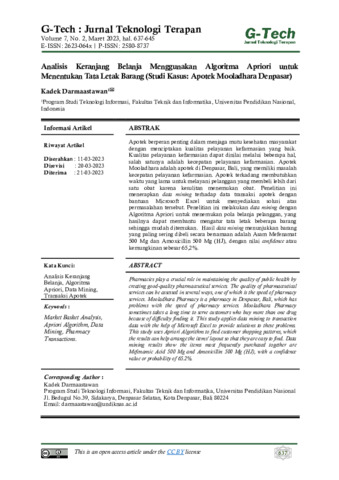 Darmaastawan, Kadek (2023) Analisis keranjang belanja menggunakan algoritma apriori untuk menentukan tata letak barang (studi kasus: Apotek Mooladhara Denpasar). G-TECH: Jurnal Teknologi Terapan, 7 (2): 32. pp. 637-645. ISSN 2580-8737