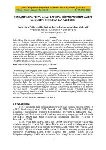 Maria, Maria and Choiruddin, Choiruddin and Indra, Satriawan and Riza, Wahyudi (2022) Pendampingan penyusunan laporan keuangan UMKM galeri Wong Kito berdasarkan SAK EMKM. Jurnal Pengabdian Masyarakat Akuntansi, Bisnis & Ekonomi (JPMABE), 1 (1). pp. 1-8. ISSN 2963-4903