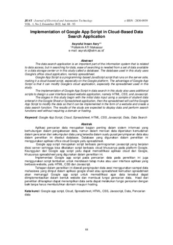 Aplikasi pencarian data merupakan bagian penting dalam sistem informasi yang berhubungan dalam pengaksesan data, namun dalam mencari data diperlukan kemudahan dalam pencarian dari sekumpulan data yang tersedia dalam suatu pusat penyimpanan data atau dalam penelitian ini disebut database. Database yang digunakan dalam penelitian ini menggunakan aplikasi office cloud Google yaitu spreadsheet. Google app script merupakan script berbasis pemrograman javascript yang berjalandisisi server sehingga bisa dikatakan script berbasis cloud khususnya pada platform Google.Keunggulan dari Google app script yaitu dapat memodifikasi aplikasi cloud dari Google,khususnya spreadsheet yang digunakan dalam penelitian ini.Implementasi Google app script pada pencarian data pada penelitian ini juga menggunakan script tambahan untuk mendesain tatap muka atau user interface aplikasi yangberbasis website, yaitu HTML, CSS dan Javascript.Tahapan dalam penelitian ini diawali penginputan data awal menggunakan sampel datamahasiswa yang diinput dalam aplikasi google sheet atau spreadsheet kemudian spreadsheet akan memanggil Google app script untuk memodifikasi agar data tersebut dapatdiimplementasikan dalam bentuk website dan membuat fungsi pencarian data. Hasil dari penelitian diharapkan dapat menampilkan data serta dapat melakukan fungsi pencarian denganbaik tanpa harus membutuhkan domain maupun hosting.