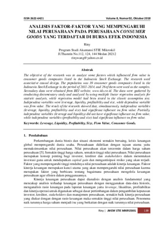 Riny, Riny (2018) Analisis faktor-faktor yang mempengaruhi nilai perusahaan pada perusahaan consumer goods yang terdaftar di Bursa Efek Indonesia. Jurnal Wira Ekonomi Mikroskil, 8 (2): 3. pp. 139-150. ISSN 2622-6421
