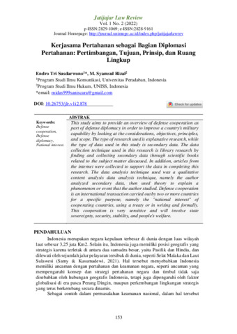 Endro, Tri Susdarwono and M., Syamsul Rizal (2022) Kerjasama pertahanan sebagai bagian diplomasi pertahanan: pertimbangan, tujuan, prinsip, dan ruang lingkup. Jatijajar Law Review, 1 (2): 6. pp. 153-166. ISSN 2829-1069