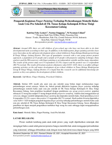 Katrina Feby, Lestari and Norma, Onggang and Ni Nyoman, Udiani (2021) Pengaruh kegiatan finger painting terhadap perkembangan motorik halus anak usia pra sekolah di TK Tunas Kelapa kelompok b Desa Tinigi, Kecamatan Galang. Jurnal Rumpun Ilmu Kesehatan, 1 (3): 10. 97 -107. ISSN 2827-9247