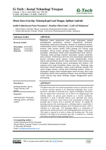 Nusantara, Ardhi Fathonisyam Putra and Oktavianto, Hardian and Muharom, Lutfi Ali (2023) Desain smart gate dan ticketing kapal laut dengan aplikasi android. G-TECH: Jurnal Teknologi Terapan, 7 (2): 42. pp. 730-736. ISSN 2580-8737