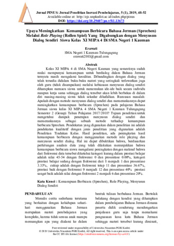 Erawati, Erawati (2019) Upaya meningkatkan kemampuan berbicara bahasa Jerman (Sprechen) Melalui Role Playing (Rollen spiel) yang digabungkan dengan menyusun dialog sendiri siswa kelas XI MIPA 4 Di SMA Negeri 1 Kauman. Jurnal PINUS: Jurnal Penelitian Inovasi Pembelajaran, 5 (1). pp. 48-52. ISSN 2442-9163