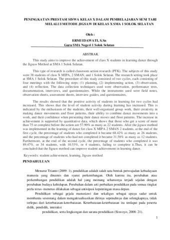 This study aims to improve the achievement of class X students in learning dance through the Jigsaw Method at SMA 1 Solok Selatan.This type of research is called classroom action research (PTK). The subjects of this study were 38 students of class X MIPA, 2 SMAN, and 1 Solok Selatan. The research setting took place at SMA 1 Solok Selatan. The procedure of this study consisted of two cycles, each consisting of four meetings with the following steps: (1) planning, (2) implementing action, (3) observation, and (4) reflection. The data collection techniques used were observation, performance tests, documentation, interviews, and questionnaires. While the instruments used were field notes, observation sheets, assessment sheets, interview guides, and questionnaires, The results showed that the positive activity of students in learning for two cycles had increased.This shows that the level of student activity during learning has increased.This is indicated by the enthusiasm of the students, their well-organized group work, their creativity in making dance movements and floor patterns, their ability to combine dance movements into a work, and their confidence when presenting their dance moves and floor patterns. The increase in achievement is supported by quantitative data, which shows that those who get a score of more than 75 or complete before the action are 57.90% as many as 22 students. After the jigsaw method was implemented in the learning of dance for class X MIPA 2 SMAN 2 students, at the end of the first cycle, the percentage of students who completed it became 68.42% as many as 26 students, and the percentage of students who had not completed it became 31.58% as many as 12 students. Furthermore, at the end of the second cycle, the percentage of students who completed it was 89.47%, or 34 students, with 10.53%, or 4 students, failing to complete it.Thus, it can be concluded that the Jigsaw method can improve student achievement in learning dance.