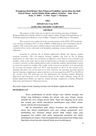 Aziz, Sufriadi (2022) Peningkatan hasil belajar mata pelajaran Pendidikan Agama Islam dan Budi Pekerti materi tajwid melalui media aplikasi Al-Kalam pada siswa kelas X MIPA 4 SMA Negeri 3 Pariaman. Jurnal Pendidikan, 3 (1): 2. pp. 8-13. ISSN 2962-4568
