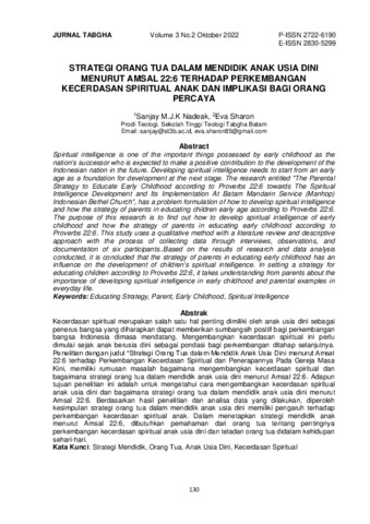 Sanjay, M.J.K Nadeak and Eva, Sharon (2022) Strategi orang tua dalam mendidik anak usia dini menurut Amsal 22:6 terhadap perkembangan kecerdasan spiritual anak dan implikasi bagi orang percaya. Jurnal Tabgha, 3 (2): 5. pp. 130-154. ISSN 2722-6190