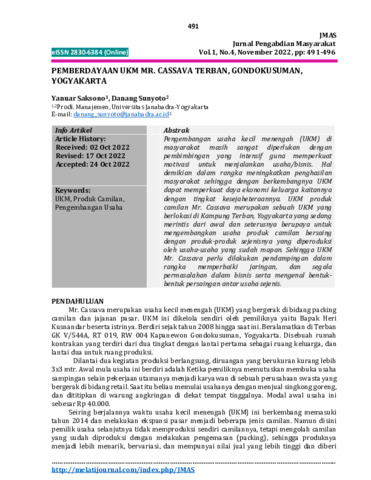 Saksono, Yanuar and Sunyoto, Danang (2022) Pemberdayaan UKM Mr. Cassava Terban, Gondokusuman, Yogyakarta. Jurnal Pengabdian Masyarakat, 1 (4): 2. pp. 491-496. ISSN 2830-6384