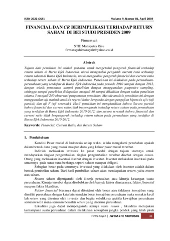 Tujuan dari penelitian ini adalah pertama untuk mengetahui pengaruh financial terhadap return saham di Bursa Efek Indonesia, untuk mengetahui pengaruh current ratio terhadap return saham di Bursa Efek Indonesia, untuk mengetahui pengaruh financial dan current ratio terhadap return saham di Bursa Efek Indonesia. Penelitian ini dilakukan pada perusahaan perusahaan yang terdaftar di Bursa Efek Indonesia pada periode 2010 sampai dengan 2012,dengan teknik penentuan sampel penelitian dengan menggunakan purposive sampling, sehingga sampel penelitian didapatkan menjadi 80 sampel dikalikan dengan waktu penelitian selama 3 menjadi 240 observasi pengamatan penelitian. Metode analisis penelitian ini dengan menggunakan uji statistik analisis regresi linier berganda dengan pengujian hipotesis uji t (uji parsial) dan uji F (uji serentak). Hasil penelitian ini menghasilkan bahwa Secara parsial bahwa financial dan current ratio tidak berpengaruh terhadap return saham pada perusahaan yang terdaftar di Bursa Efek Indonesia 2010-2012, dan secara serentak bahwa financial dan current ratio tidak berpengaruh terhadap return saham pada perusahaan yang terdaftar di Bursa Efek Indonesia 2010-2012.