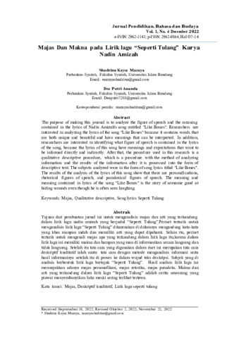 Tujuan dari pembuatan jurnal ini untuk menganalisis majas dan arti yang terkandung dalam lirik lagu nadin amizah yang berjudul “Seperti Tulang”.Periset tertarik untuk menganalisis lirik lagu “Seperti Tulang” dikarenakan di dalamnya mengandung kata-kata yang khas maupun indah dan memiliki arti yang dapat dipahami. Selain itu, periset tertarik untuk mengenali majas apa yang terkandung dalam lirik lagu itu,karena dalam lirik lagu ini memiliki makna dan harapan yang mau di informasikan secara langsung dan tidak langsung. Setelah itu tata cara yang digunakan dalam riset ini merupakan tata cara deskriptif kualitatif ialah suatu tata cara dengan metode menganalisis informasi serta hasil informasinya setelah itu di proses ke dalam wujud teks deskripsi. Subjek yang di analisis berbentuk lirik lagu bertajuk “Seperti Tulang”. Hasil analisis lirik lagu ini menunjukkan adanya majas personafikasi, majas retorika, majas paradoks. Makna dan arti yang terkandung dalam lirik lagu “Seperti Tulang” adalah cerita seseorang yang piawai menyembunyikan luka meski sering terlihat tertawa.