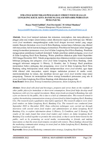 Hasya Nindi, Fadillah and Feni, Desvianda and M Afrizal, Maulana (2022) Strategi komunikasi pemasaran street food di Jalan Lengkong Kecil Kota Bandung dalam menarik perhatian pengunjung. Jurnal Manajemen Kompeten, 5 (2): 3. pp. 30-37. ISSN 2621-5381
