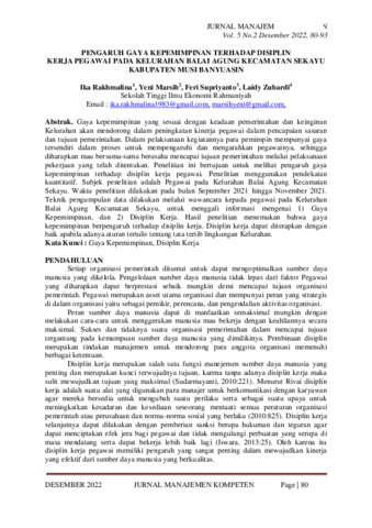 Ika, Rakhmalina and Yeni, Marsih and Feri, Supriyanto and Laidy, Zubardi (2022) Pengaruh gaya kepemimpinan terhadap disiplin kerja pegawai pada Kelurahan Balai Agung Kecamatan Sekayu Kabupaten Musi Banyuasin. Jurnal Manajemen Kompeten, 5 (2): 7. pp. 80-93. ISSN 2621-5381
