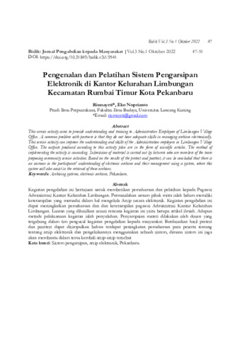 Rismayeti, Rismayeti and Eko, Noprianto (2022) Pengenalan dan pelatihan sistem pengarsipan elektronik di kantor Kelurahan Limbungan Kecamatan Rumbai Timur Kota Pekanbaru. Bidik: Jurnal Pengabdian kepada Masyarakat, 3 (1): 8. pp. 47-51. ISSN 2747-2019