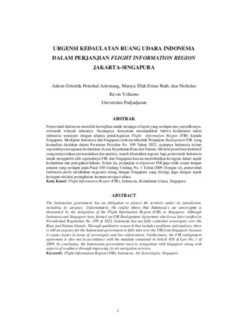Aileen Griselda Petrolud, Aritonang and Marsya Iffah Erisar, Raib and Nicholas Kevin, Yolianto (2023) Urgensi kedaulatan ruang udara Indonesia dalam perjanjian flight information region Jakarta-Singapura. ALSA Indonesia Law Journal, 4 (2): 1. pp. 1-24. ISSN 2656-5420