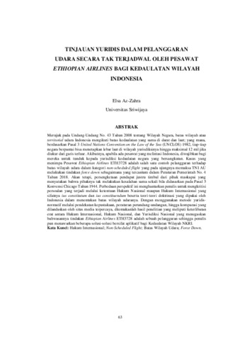 Elsa, Az-Zahra (2023) Tinjauan yuridis dalam pelanggaran udara secara tak terjadwal oleh pesawat Ethiopian Airlines bagi kedaulatan wilayah Indonesia. ALSA Indonesia Law Journal, 4 (2): 4. pp. 63-75. ISSN 2656-5420