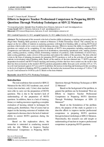 Liswati, Liswati and Usman, Jayadi and Riinawati, Riinawati (2022) Efforts to improve teacher professional competence in preparing HOTS questions through workshop techniques at SDN 22 Mataram. International Journal of Education and Digital Learning, 1 (1): 3. pp. 13-18. ISSN 2962-052X