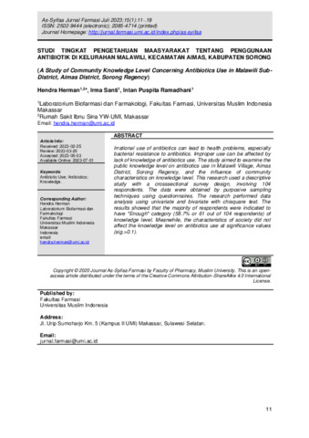 Hendra Herman and Irma Santi and Intan Puspita Ramadhani (2023) Studi tingkat pengetahuan masyarakat tentang penggunaan antibiotik di kelurahan Malawili, kecamatan Aimas, kabupaten Sorong. As-Syifaa : Jurnal Farmasi, 15 (1): 2. 11 -19. ISSN 2085-4714