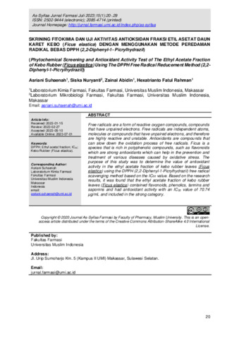 Asriani, Suhaenah and Siska, Nuryanti and Zainal, Abidin and Hexatrianto Fatul, Rahman (2023) Skrining fitokimia dan uji aktivitas antioksidan fraksi etil asetat daun karet kebo (Ficus elastica) dengan menggunakan metode peredaman radikal bebas DPPH (2,2-diphenyl-1- picrylhydrazil). As-Syifaa : Jurnal Farmasi, 15 (1): 3. pp. 20-29. ISSN 2085-4714