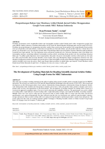 Dyan, Permata Yanda and Asriani, Asriani (2023) Pengembangan bahan ajar membaca artikel ilmiah Jurnal Online menggunakan Google form untuk MKU Bahasa Indonesia. Jurnal Pembelajaran Bahasa dan Sastra (Jurnal Pembahas), 2 (1). pp. 1-8. ISSN 2809-5367