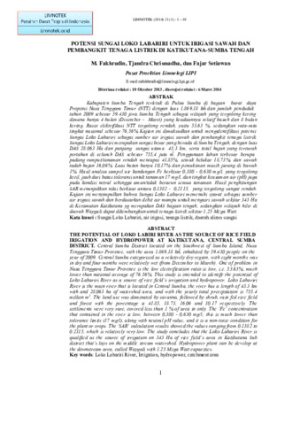 Kabupaten Sumba Tengah terletak di Pulau Sumba di bagian barat daya Propinsi Nusa Tenggara Timur (NTT) dengan luas 1.869,18 km2 dan jumlah penduduk tahun 2009 sebesar 59.430 jiwa. Sumba Tengah sebagai wilayah yang tergolong kering dimana hanya 4 bulan (Desember - Maret) yang keadaannya relatif basah dan 8 bulan kering. Rasio elektrifikasi NTT tergolong rendah, yaitu 53,63 %, sedangkan rata-rata tingkat nasional sebesar 76,56%. Kajian ini dimaksudkan untuk mengidentifikasi potensi Sungai Loko Labariri sebagai sumber air irigasi sawah dan pembangkit tenaga listrik. Sungai Loko Labariri merupakan sungai besar yang berada di Sumba Tengah, dengan luas DAS 28.063 Ha dan panjang sungai utama 43,3 km, serta total hujan yang tercurah pertahun di seluruh DAS sebesar 755,4 juta m3. Penggunaan lahan terbesar berupa padang rumput/tanaman rendah mencapai 41,85%, semak belukar 18,73%, dan sawah tadah hujan 16,06%. Luas hutan hanya 10,17% dan pemukiman masih jarang di bawah 1%. Hasil analisa sampel air kandungan Fe berkisar 0,380 - 0,630 mg/l, yang tergolong kecil, jauh dari batas toleransi untuk tanaman 17 mg/l, dan tingkat keasaman air (pH) juga pada kondisi netral sehingga aman/tidak beracun semua tanaman. Hasil penghitungan SAR menunjukkan nilai berkisar antara 0,1382 - 0,2115, yang tergolong sangat rendah. Kajian ini menyimpulkan bahwa Sungai Loko Labariri memenuhi syarat sebagai sumber air irigasi sawah dan berdasarkan debit air mampu untuk mengairi sawah sekitar 343 Ha di Kecamatan Katikutana yg merupakan DAS bagian tengah, sedangkan wilayah hilir di daerah Waygali dapat dikembangkan untuk tenaga listrik sekitar 1,25 Mega Watt.