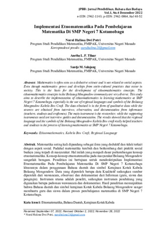Nurul, Halima Dwi Putri and Anetha, L. F. Tilaar and Santje, M. Salajang (2022) Implementasi Etnomatematika pada pembelajaran Matematika di SMP Negeri 7 Kotamobagu. JPBB : Jurnal Pendidikan, Bahasa dan Budaya, 1 (4). pp. 40-52. ISSN 2962-0864