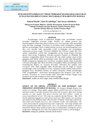 Khoirul, Muslih and Enan, M Adiwilaga and Soeryo, Adiwibowo (2014) Pengaruh penambangan timah terhadap keanekaragaman ikan sungai dan kearifan lokal masyarakat di Kabupaten Bangka. Limnotek : Perairan Darat Tropis di Indonesia, 21 (1): 6. pp. 52-63. ISSN 2549-8029