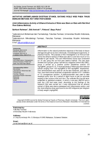 Safriani, Rahman and Sitti, Amirah and Fitriana, Fitriana and Bayu, Putra (2023) Aktivitas antiinflamasi ekstrak etanol batang wole woe pada tikus dengan metode Rat Hind Paw Edema. As-Syifaa : Jurnal Farmasi, 15 (1): 4. 30 -36. ISSN 2085-4714
