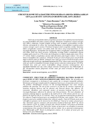 Salah satu permasalahan dalam pengelolaan perairan darat adalah penurunan kualitas air yang disebabkan oleh polusi senyawa nitrogen. Mekanisme transformasi senyawa nitrogen oleh bakteri indigenous menjadi langkah penting untuk mengatasi permasalahan tersebut. Aktivitas antropogenik di sekitar Situ Sawangan-Bojongsari memungkinkan terjadinya polusi senyawa nitrogen seperti amonia. Penelitian bertujuan untuk mengetahui struktur komunitas bakteri pengoksidasi amonia serta faktor fisika dan kimia yang mempengaruhinya di Situ Sawangan-Bojongsari. Kelimpahan dan keragaman bakteri pengoksidasi amonia dipengaruhi oleh faktor fisika dan kimia perairan. Kelimpahan tertinggi bakteri pengoksidasi amonia terdapat pada strata 0 cm (270 sel/mL) dan kelimpahan terendah terdapat pada strata 230 cm (73 sel/mL). Bakteri pengoksidasi amonia tidak ditemukan pada bagian sedimen. Gen amoA hanya teramplifikasi dari contoh air. Sebanyak 10 pita gen amoA dengan posisi yang berbeda dapat terdeteksi pada gel DGGE. Sebanyak enam isolat gen amoA memiliki kemiripan sekuennukleotida dengan amoA dari uncultured bacterium (86-97%). Sekuen asam amino dari keenamisolat gen amoA menunjukkan kemiripan dengan protein ammonia monooxygenase (56-93%).Sebanyak lima isolat gen amoA teridentifikasi sebagai ammonia monooxygenase dariuncultured bacterium dan satu isolat sebagai ammonia monooxygenase dari Nitrosospira sp.III7. Berdasarkan analisis filogenetik, keenam isolat gen amoA termasuk ke dalam genus Nitrosospira.