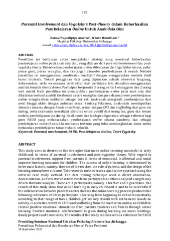 Ratna, Prayudiptya Azarine and Wiwin, Hendriani (2022) Parental involvement dan vygotsky’s post-theory dalam keberhasilan pembelajaran online untuk anak usia dini. Proceeding Series of Psychology, 1 (1): 19. pp. 187-201. ISSN 2986-1101