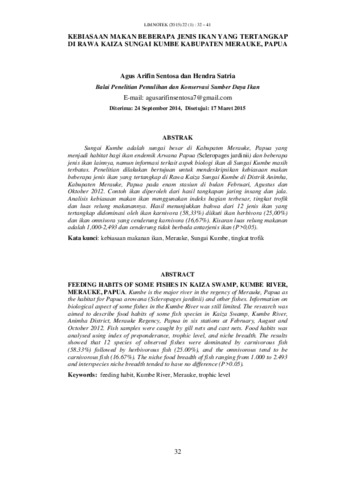 Sungai Kumbe adalah sungai besar di Kabupaten Merauke, Papua yang menjadi habitat bagi ikan endemik Arwana Papua (Scleropages jardinii) dan beberapajenis ikan lainnya, namun informasi terkait aspek biologi ikan di Sungai Kumbe masihterbatas. Penelitian dilakukan bertujuan untuk mendeskripsikan kebiasaan makan beberapa jenis ikan yang tertangkap di Rawa Kaiza Sungai Kumbe di Distrik Animha, Kabupaten Merauke, Papua pada enam stasiun di bulan Februari, Agustus danOktober 2012. Contoh ikan diperoleh dari hasil tangkapan jaring insang dan jala.Analisis kebiasaan makan ikan menggunakan indeks bagian terbesar, tingkat trofikdan luas relung makanannya. Hasil menunjukkan bahwa dari 12 jenis ikan yangtertangkap didominasi oleh ikan karnivora (58,33%) diikuti ikan herbivora (25,00%)dan ikan omnivora yang cenderung karnivora (16,67%). Kisaran luas relung makananadalah 1,000-2,493 dan cenderung tidak berbeda antarjenis ikan (P>0,05).