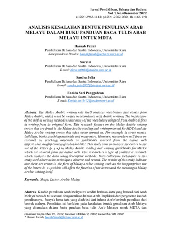 Hasnah, Faizah and Nuraini, Nuraini and Sandra, Julia and Ennida, Sari Panggabean (2022) Analisis kesalahan bentuk penulisan Arab Melayu dalam buku panduan baca tulis Arab Melayu untuk MDTA. Jurnal Pendidikan, Bahasa dan Budaya, 1 (4). pp. 166-178. ISSN 2962-0864