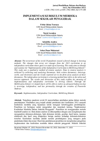Febia, Ghina Tsuraya and Nurul, Azzahra and Salsabila, Azahra and Sekar, Puan Maharani (2022) Implementasi kurikulum merdeka dalam sekolah penggerak. Jurnal Pendidikan, Bahasa dan Budaya, 1 (4). pp. 179-188. ISSN 2962-0864
