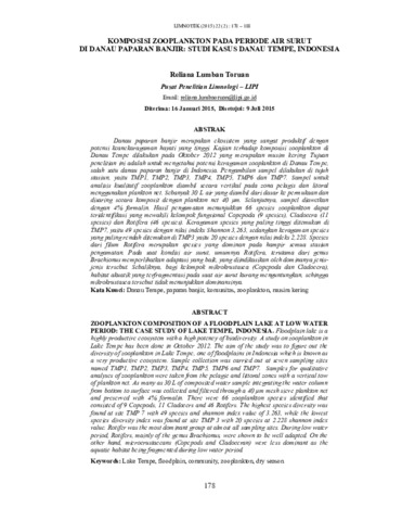 Reliana, Lumban Toruan (2015) Komposisi zooplankton pada periode air surut di danau paparan banjir: studi kasus Danau Tempe, Indonesia. Limnotek : Perairan Darat Tropis di Indonesia, 22 (2): 7. pp. 178-188. ISSN 2549-8029