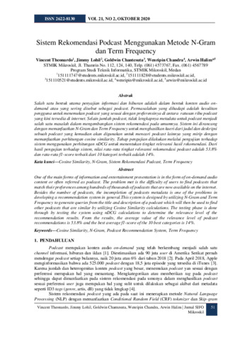 Vincent, Theonardo and Jimmy, Lohil and Goldwin, Chantesuta and Wenripin, Chandra and Arwin, Halim (2020) Sistem rekomendasi podcast menggunakan metode n-gram dan term frequency. Jurnal Sifo Mikroskil, 21 (2): 1. pp. 51-60. ISSN 2622-8130