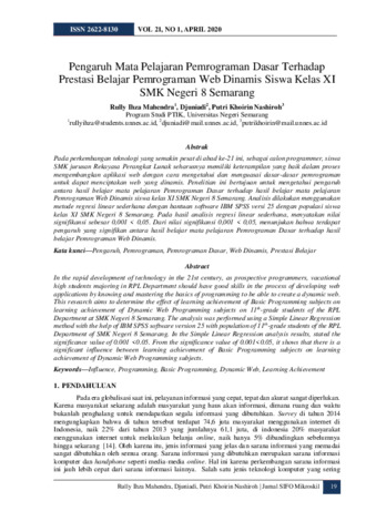 Rully, Ihza Mahendra and Djuniadi, Djuniadi and Putri Khoirin Nashiroh, Putri Khoirin Nashiroh (2020) Pengaruh mata pelajaran pemrograman dasar terhadap prestasi belajar pemrograman web dinamis siswa kelas XI SMK Negeri 8 Semarang. Jurnal Sifo Mikroskil, 21 (1): 3. pp. 19-26. ISSN 2622-8130