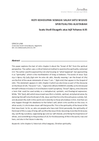 Gracia, Lina (2022) Roti kehidupan sebagai salah satu wujud spiritualitas Alkitabiah: Suatu studi eksegetis atas Injil Yohanes 6:35. Aradha: Journal of Divinity, Peace and Conflict Studies, 2 (1): 2. pp. 19-35. ISSN 2774-8588